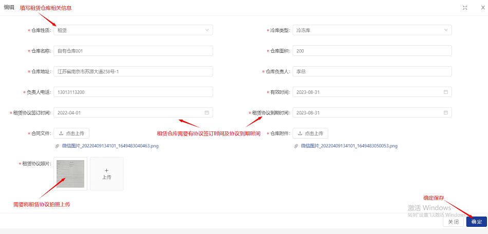 点击“新增”仓库性质选择:租赁,选择冷库类型,填写仓库名称、仓库面积、仓库地址、仓库负责人电话、上传合同文件等相关信息,租赁仓库需要上传租赁协议拍照件,并填写租赁协议签订及协议到期时间,填写完成后,点击确定保存。