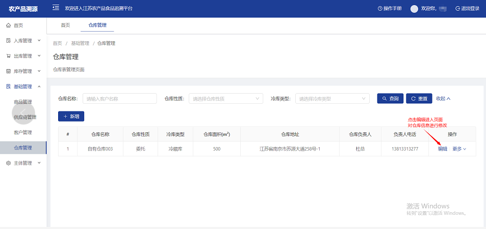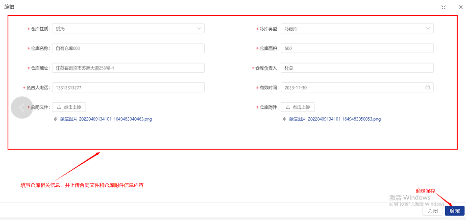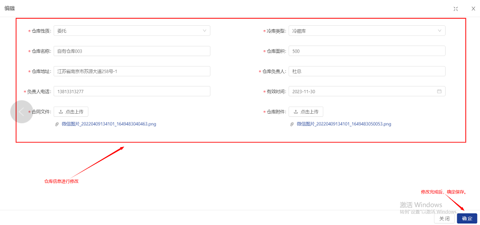 选择需要修改的仓库信息,点击“编辑”进入页面,可以对仓库性质、冷库类型、仓库名称、仓库面积、仓库地址、仓库负责人电话等相关信息进行修改,输入完成后,点击确定保存。