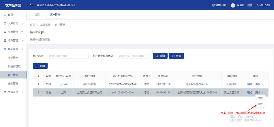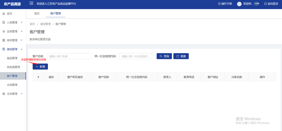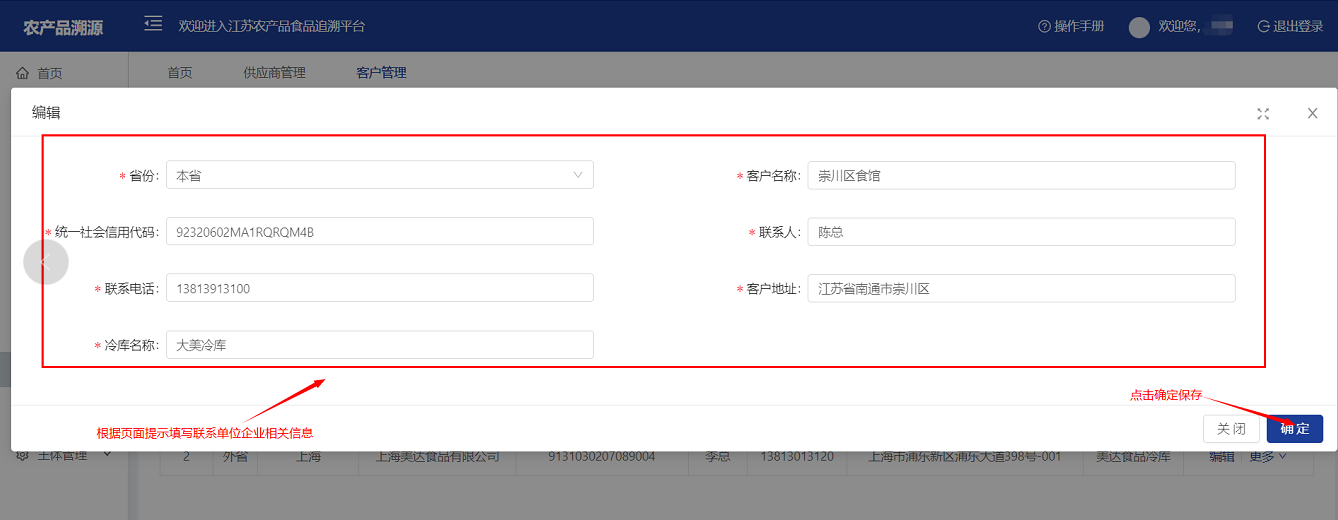 1)点击“新增”选择“本省”,填写客户名称、统一社会信用代码、联系人、联系电话、客户地址及冷库名称,点击确定保存。