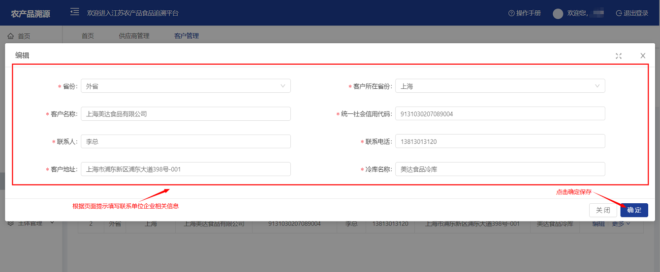 点击“新增”选择“外省”,选择客户所在省份,填写供应商名称、统一社会信用代码、联系人、联系电话、客户地址及冷库名称,点击确定保存。