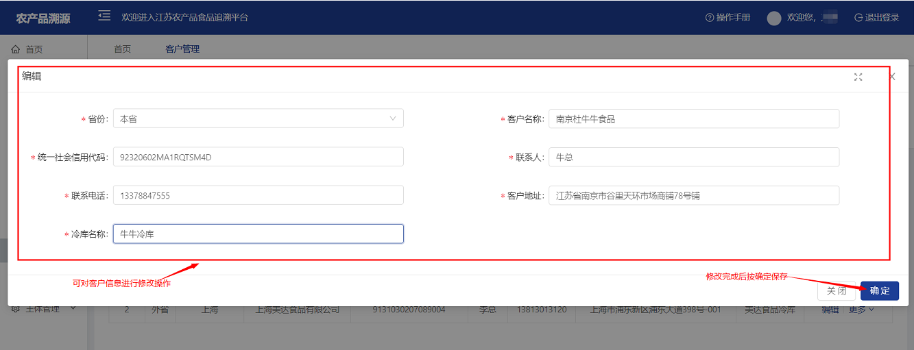 选择需要修改的联系单位客户信息,点击“编辑”进入页面,可对客户信息进行修改操作,修改完成后按确定保存。