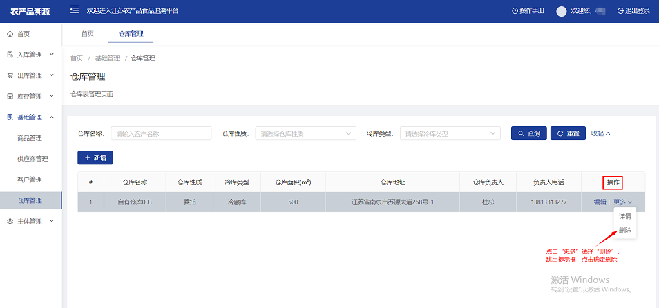 企业对已有的仓库进行删除操作,点击“更多”选择“删除”,跳出提示框,点击确定保存,即可删除仓库信息。
