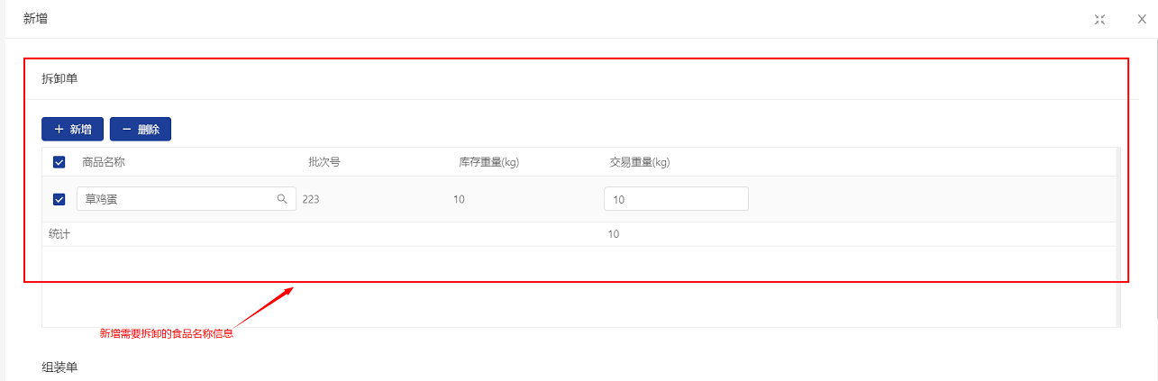 1.点击“新增”,进入组装拆卸界面,在拆卸单中新增选择需要拆卸的食品信息,输入需要拆卸的食品重量。