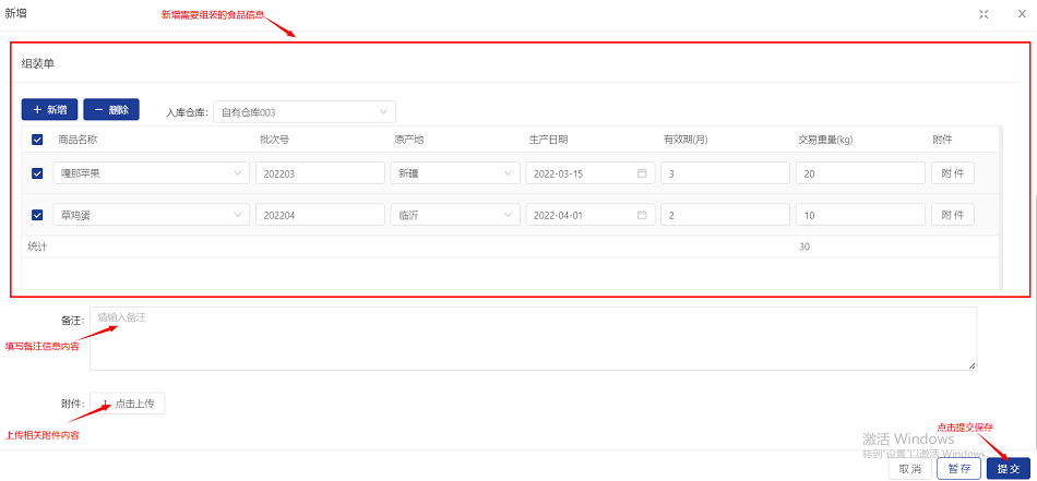 2.在组装单中点击“新增”添加组装的产品相关信息,填写相关备注信息,上传附件内容信息后,点击提交保存拆卸及组装单。