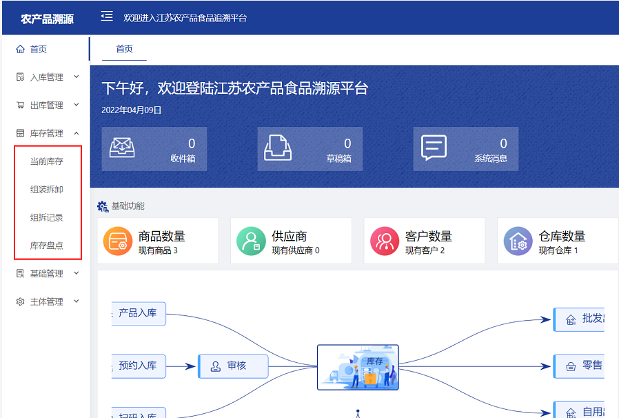 库存管理包括:当前库存、组装拆卸、组拆记录及库存盘点(暂未开发此功能)四个菜单功能。
