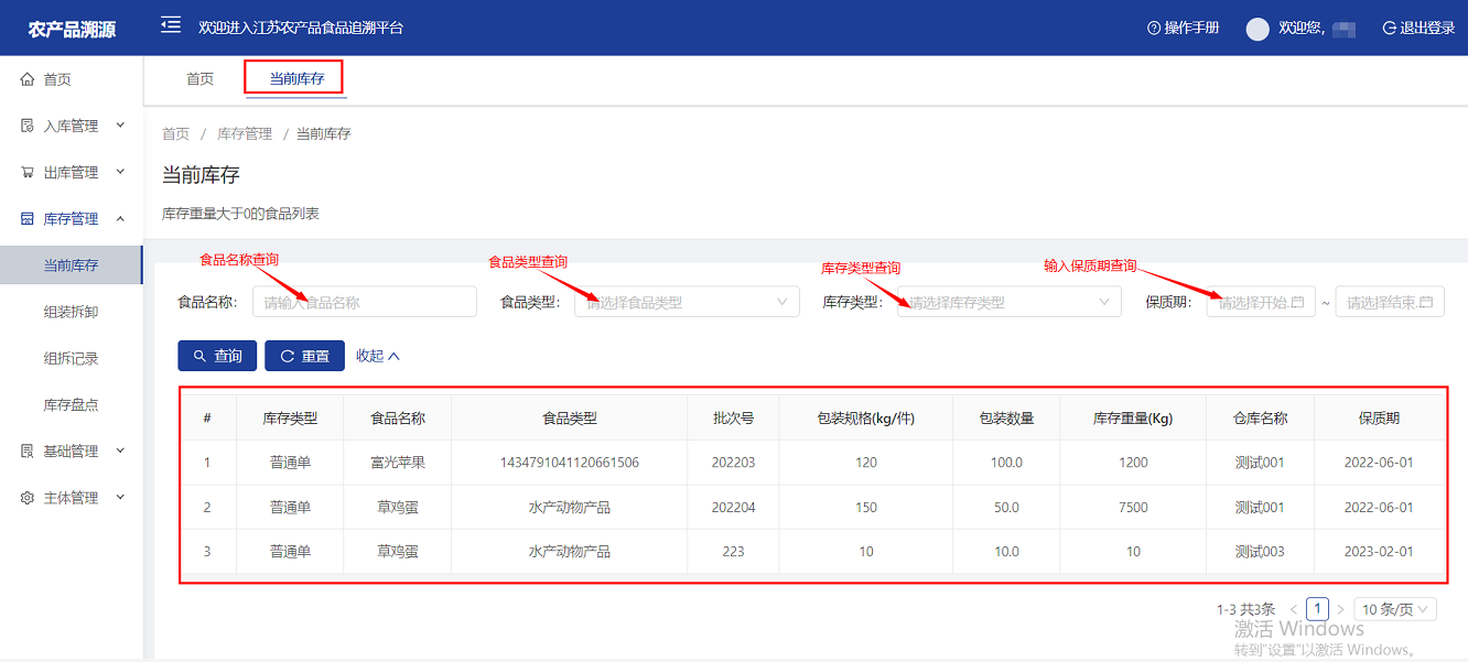 一、当前库存:企业可以查看在库的食品库存情况。
