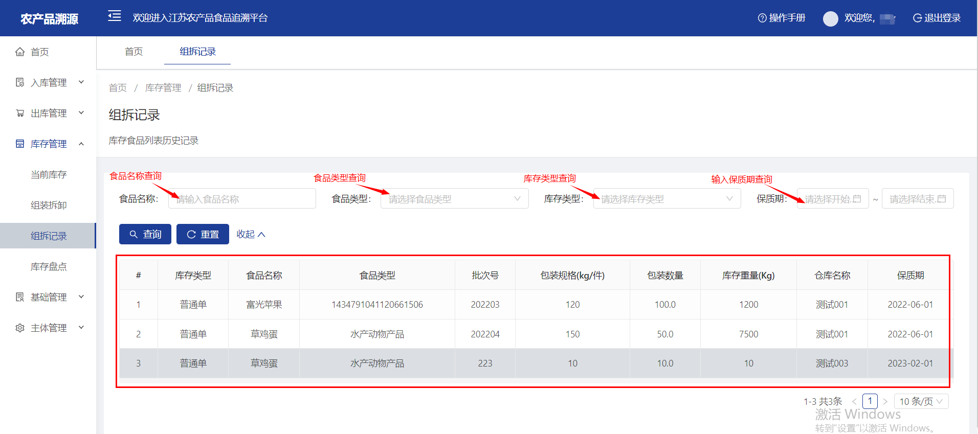 三、组拆记录:企业通过食品名称查询、食品类型、库存类型及输入保质期查询组拆记录。