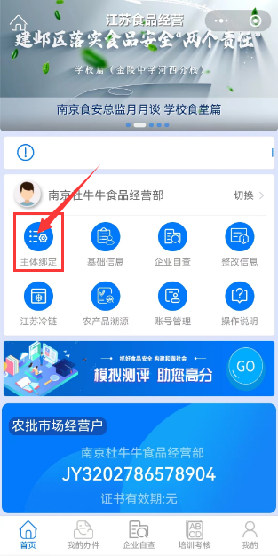 主体绑定用于录入账号关联的企业信息,在登录账号后进行,需填写主体名称、统一社会信用代码、食品许可证号以及在该企业的身份,完善企业相关信息,完成绑定。
