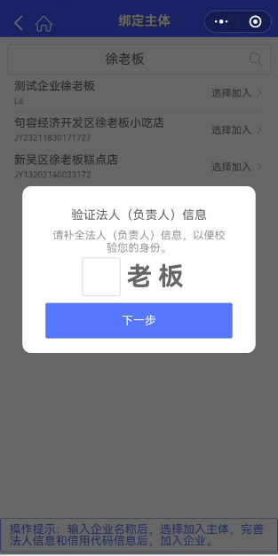三、企业可以绑定多个主体,通过主体绑定管理菜单进行切换企业主体,可选择进入不同的企业主体信息中进行操作。(一个手机账号最多可以绑定5个主体)