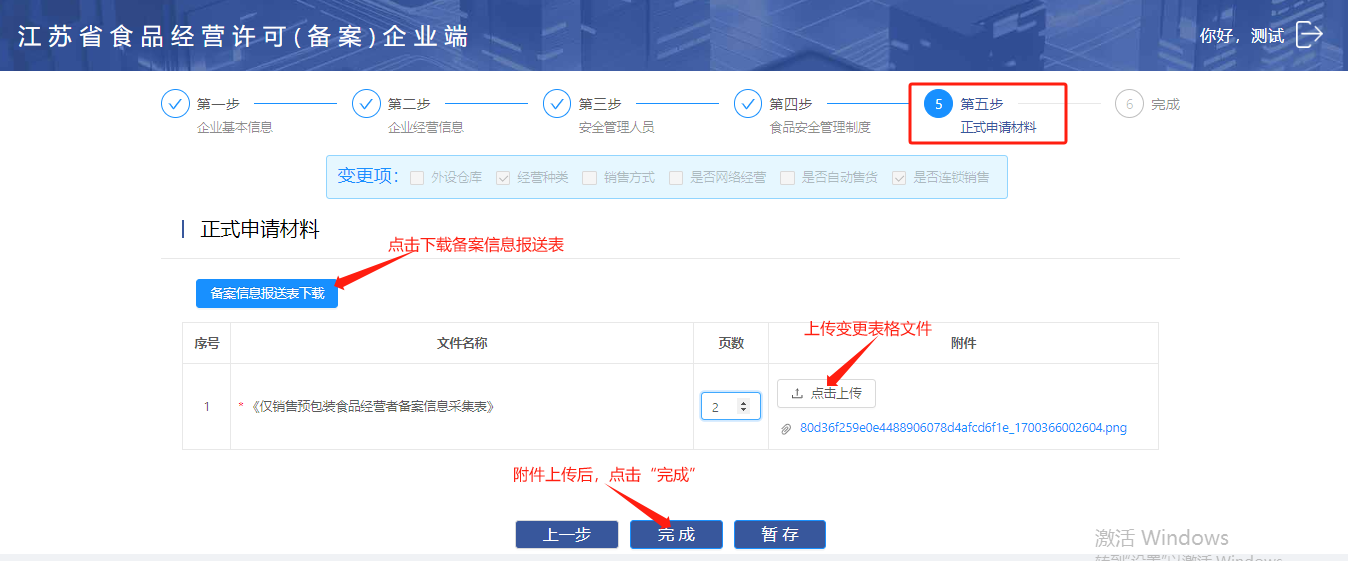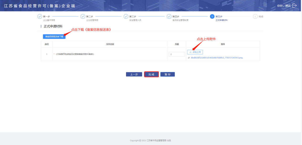 进入【正式申请材料】菜单页面,点击【备案信息报送表下载】下载相关的表格,表格内容填写完成后,【点击上传】按钮处上传附件内容,最后点击【完成】提交申请材料。