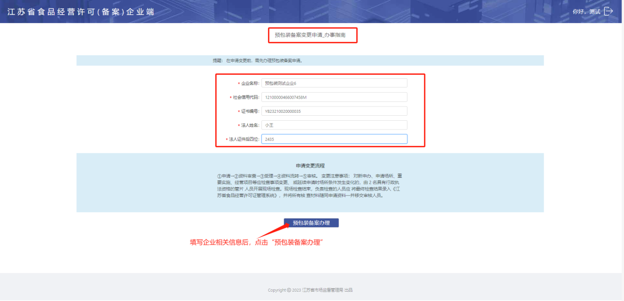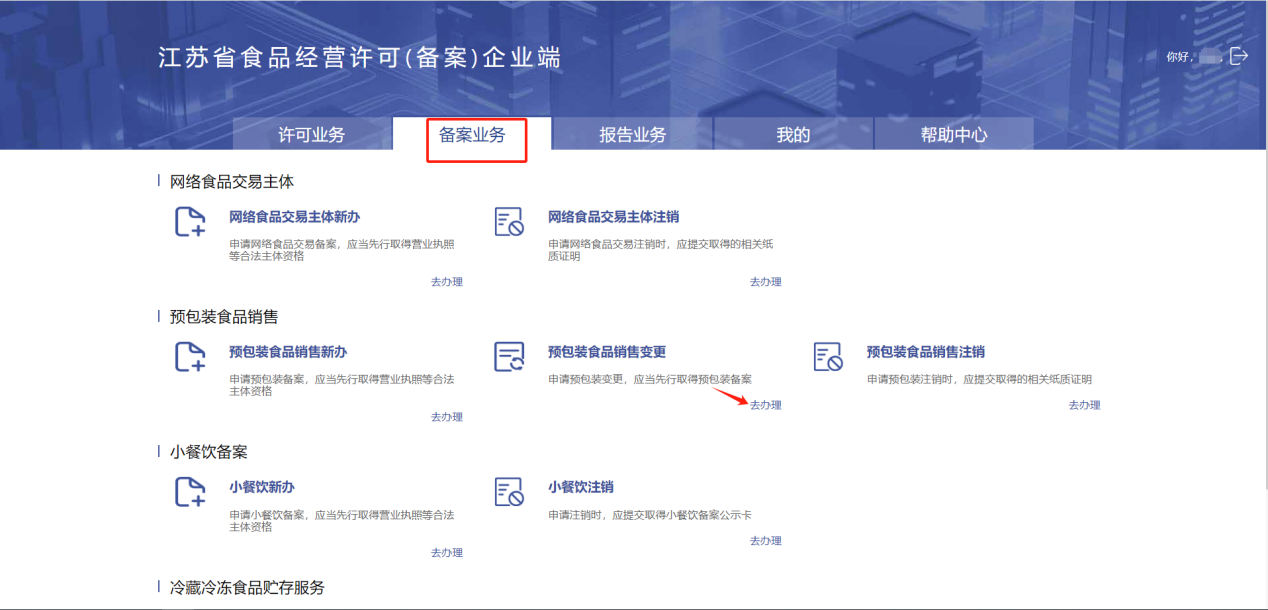 进入【备案业务】-【预包装食品销售】-【预包装食品销售变更】点击“去办理”进入预包装食品销售变更申请页面。