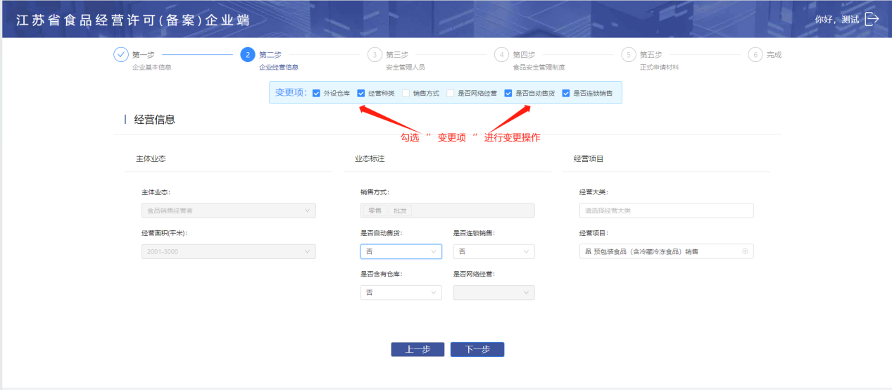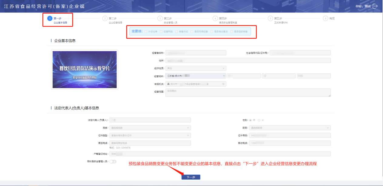 预包装食品销售变更业务不能变更企业的基本信息内容,直接点击【下一步】进入企业经营信息变更业务流程。