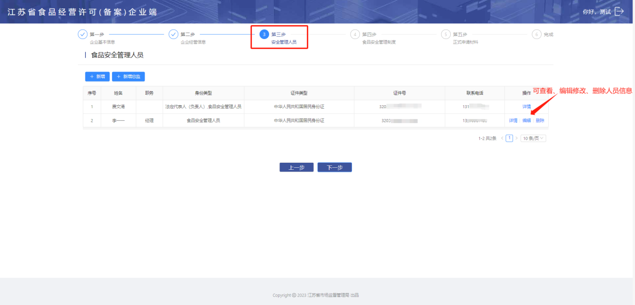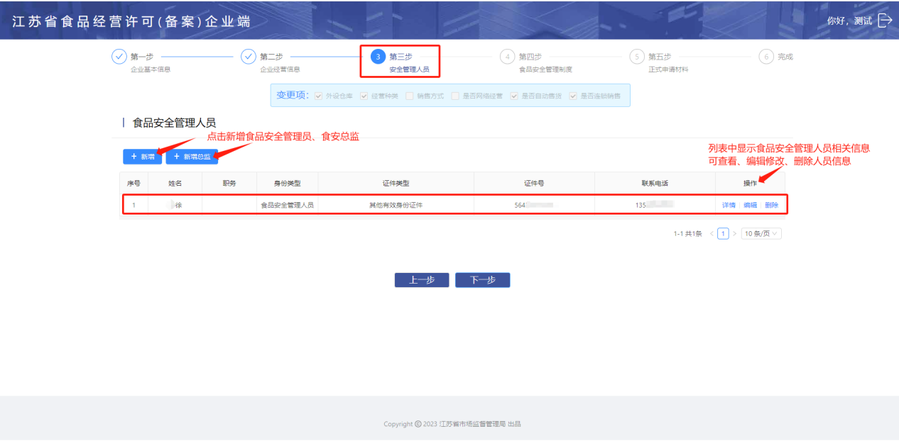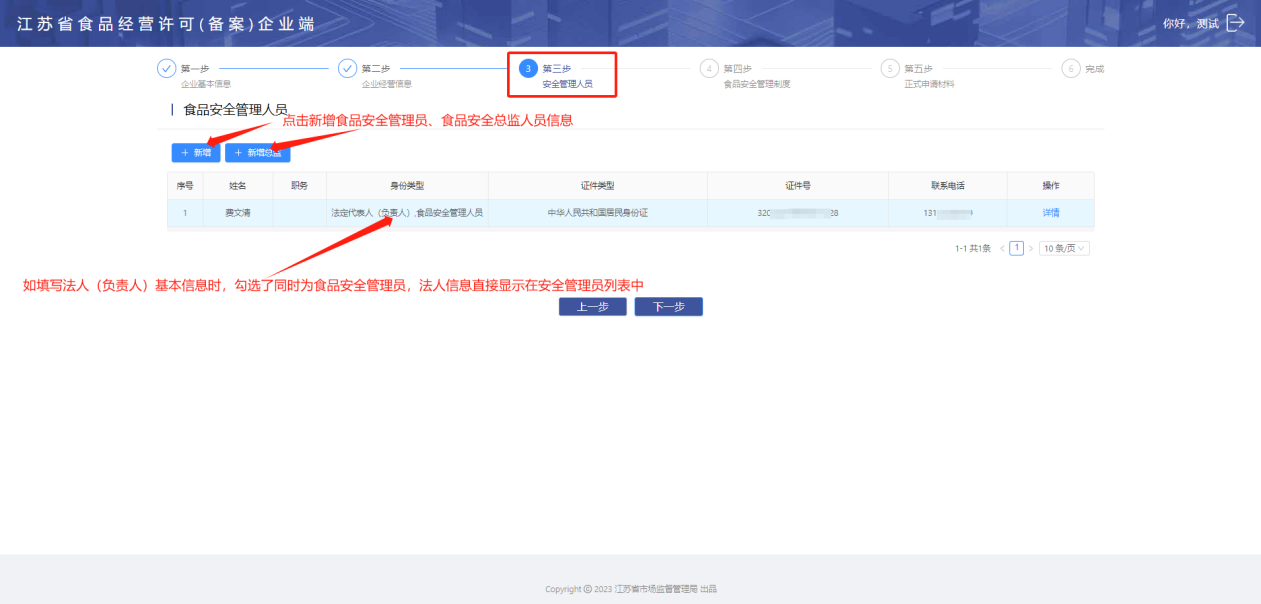 【注】如填写法人(负责人)基本信息时,勾选了同时是食品安全管理员【是】,法人信息会直接显示在安全管理员列表中,点击【详情】可以查看人员信息。