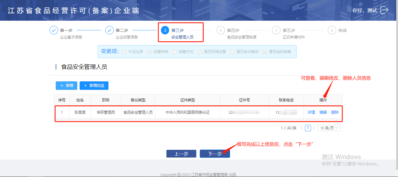 食品安全管理员添加完成后,点击“下一步”