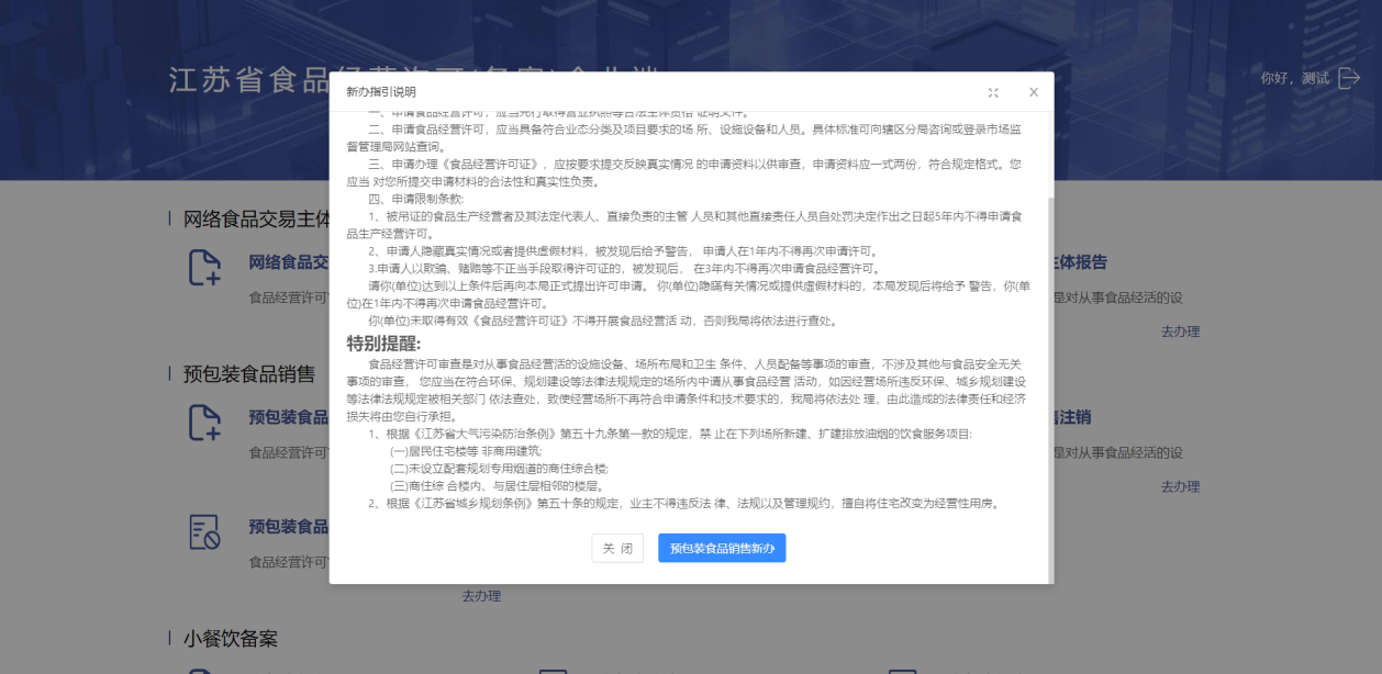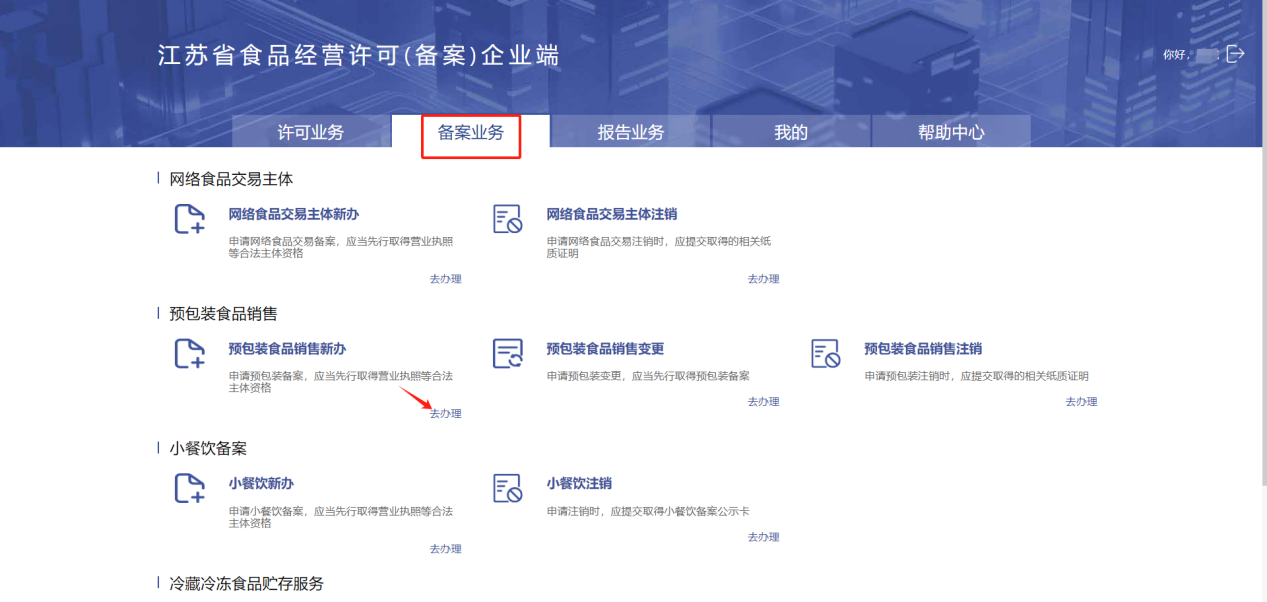 进入【备案业务】-【预包装食品销售】-【预包装食品销售新办】点击“去办理”进入预包装食品销售申请页面。