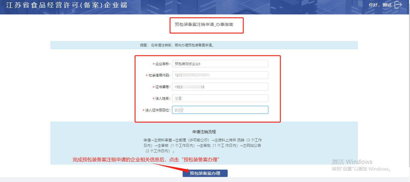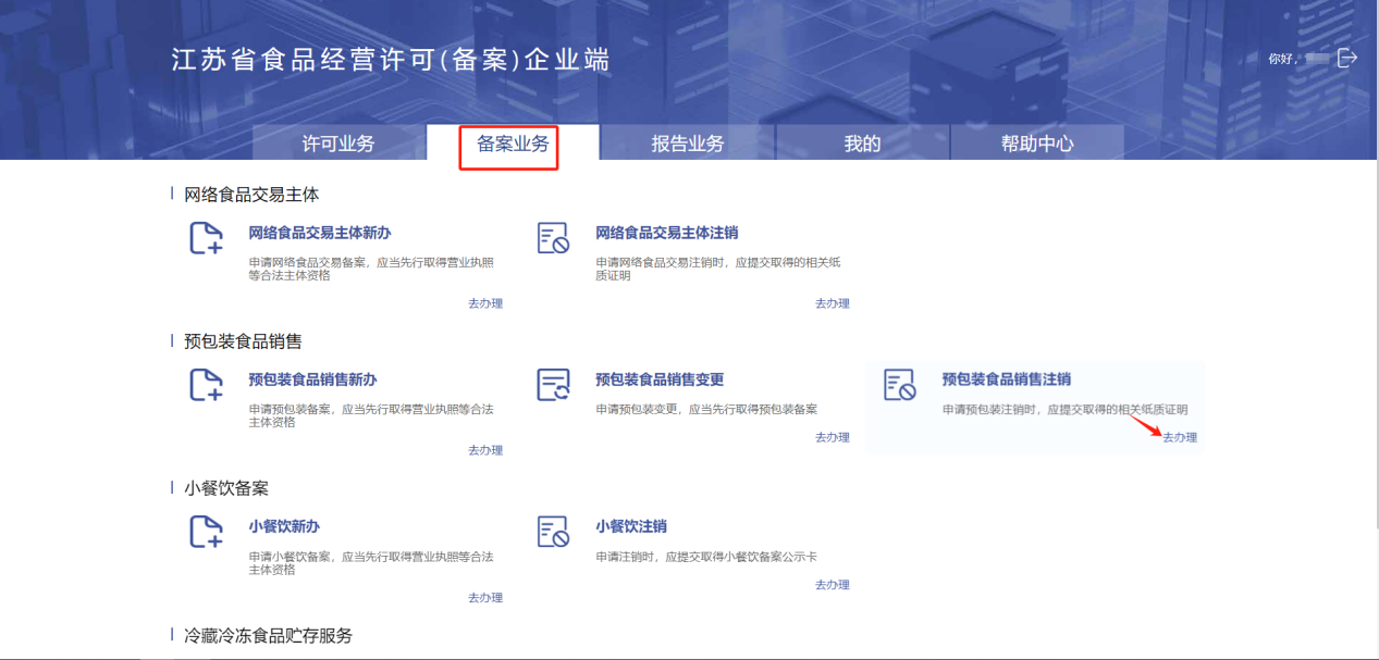 进入【备案业务】-【预包装食品销售】-【预包装食品销售注销】点击“去办理”进入预包装食品销售注销申请页面