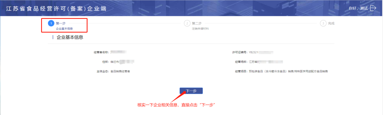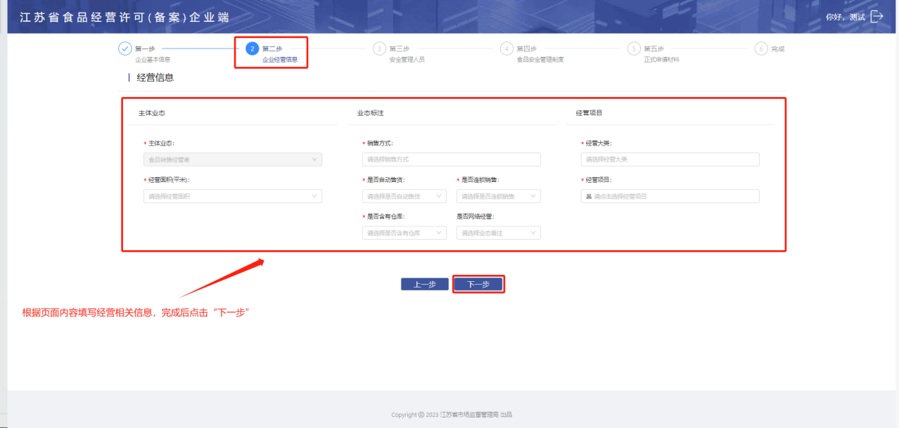 根据页面菜单填写相关的经营信息,填写完成后点击“下一步”