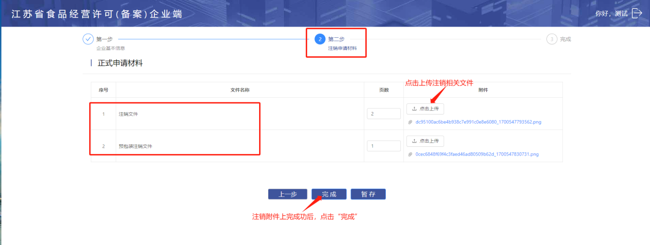在【正式申请材料】菜单中点击【备案信息报送表下载】,打印、签字、盖章,附件上传后,点击【完成】提交预包装食品销售申请。