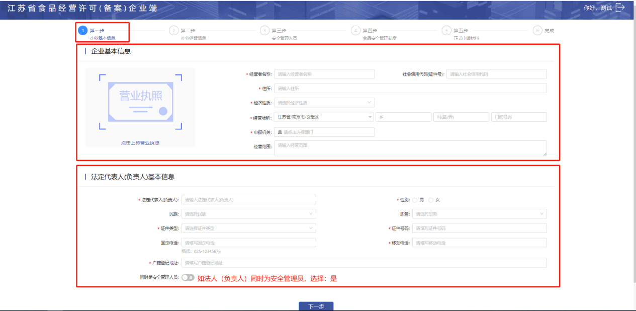 填写企业的基本信息及法定代表人(负责人)基本信息,如法人(负责人)同时是食品安全管理人员,点击选择:是,填写完成后,点击“下一步”。