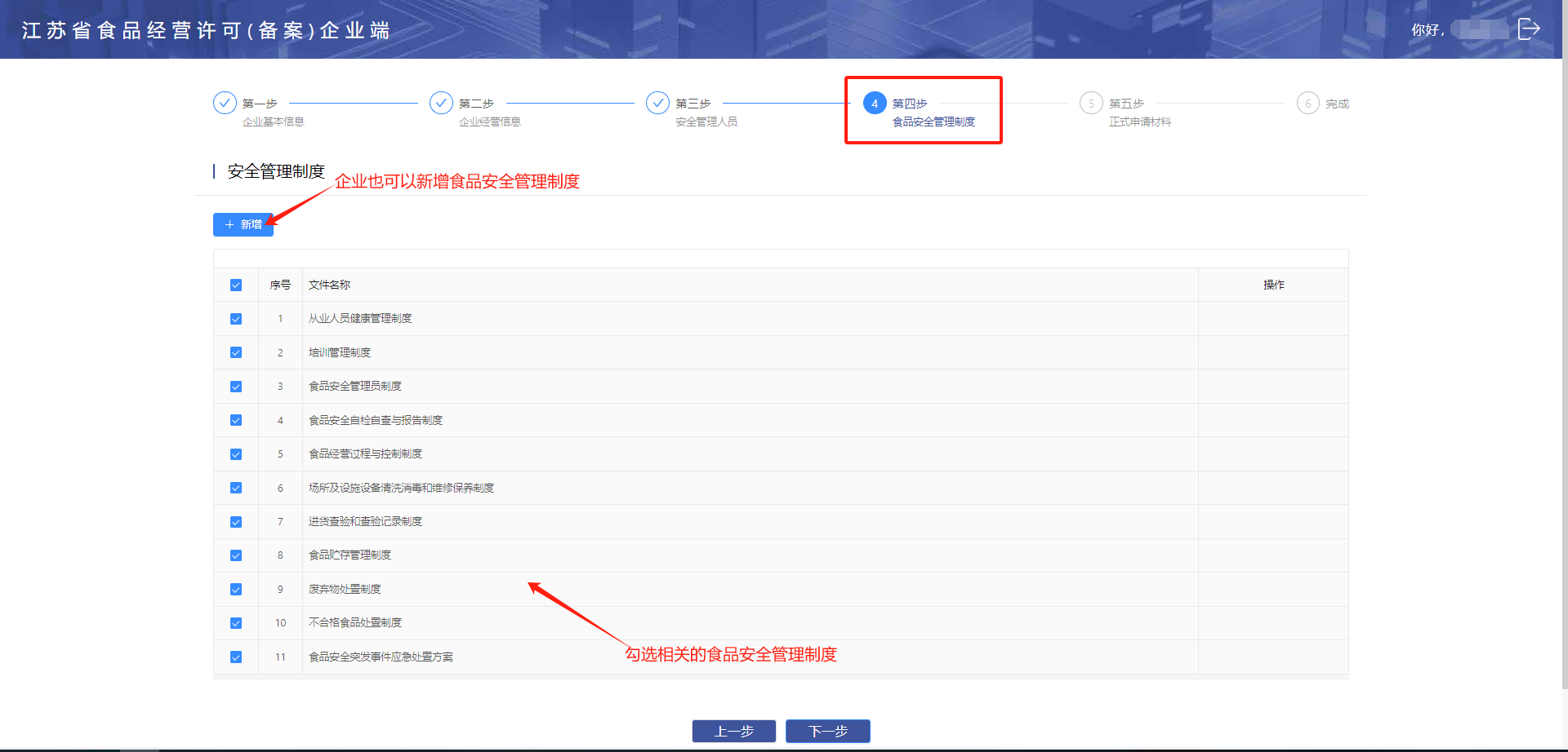 勾选安全管理制度或新增安全管理制度完成后,点击进入“下一步”