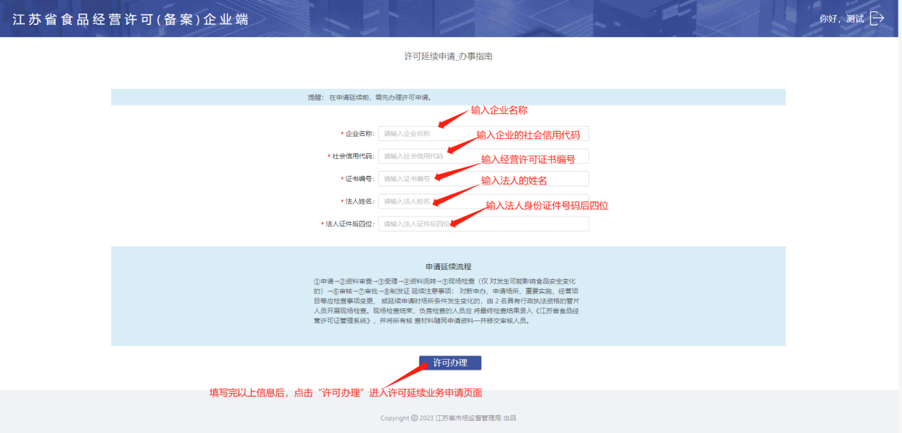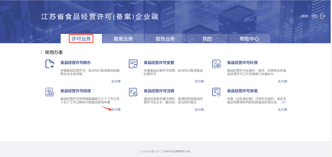 进入【许可业务】-【食品经营许可延续】,点击“去办理”进入食品经营许可延续申请页面