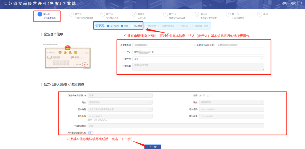 企业在延续业务申请时,如涉及到变更企业的名称、住所或法人(负责人)基本信息,可以在“变更项”中进行勾选变更操作,填写完成后点击“下一步”
