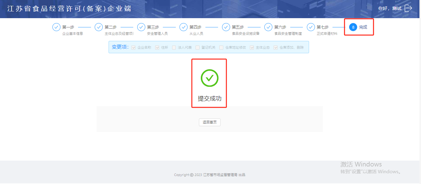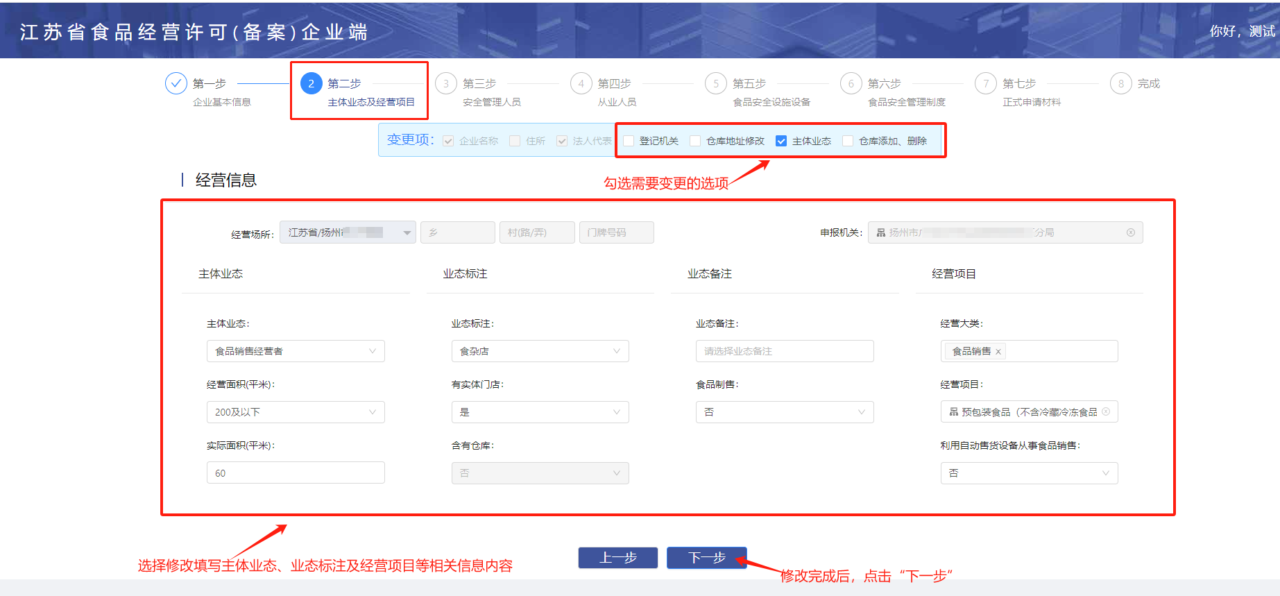 企业在延续业务申请时,如涉及到变更企业的登记机关、主体业态、仓库的新增、删除以及仓库地址的修改,可以在“变更项”中进行勾选变更操作,填写完成后点击“下一步”