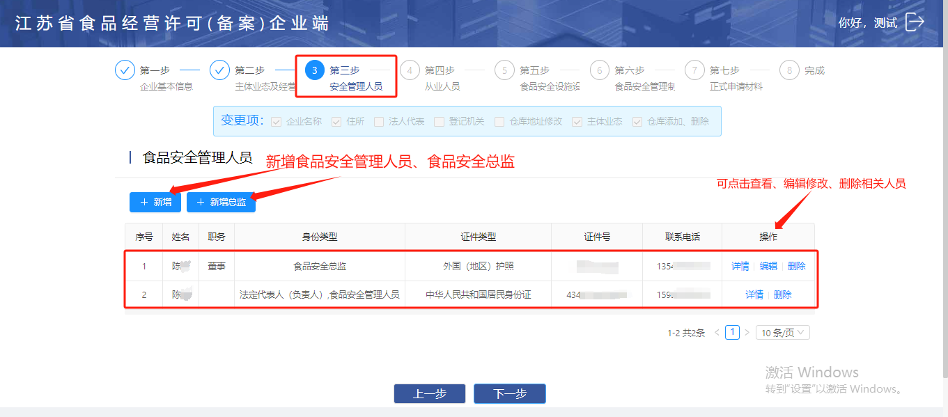 如需要新增安全管理人员或食品安全总监,可直接点击【新增】按钮添加人员信息