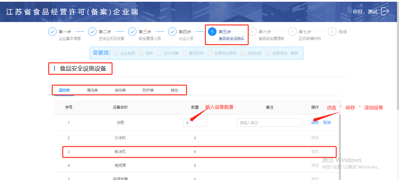 菜单页面会显示已存在的食品安全设施设备,点击【修改】可以调整相关的设施设备,修改完成后点击【保存】即可,继续点击【下一步】