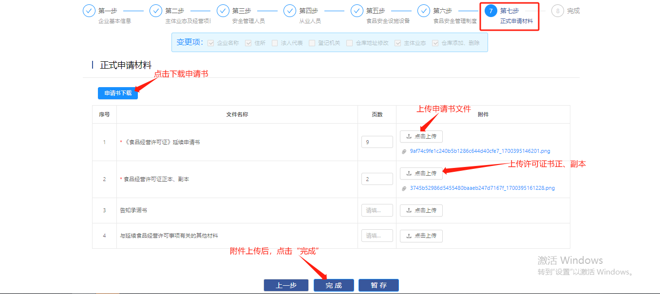 在【正式申请材料】菜单中点击【申请书下载】,然后上传申请书文件、食品经营许可证书正本、副本,上传附件后点击【完成】提交。