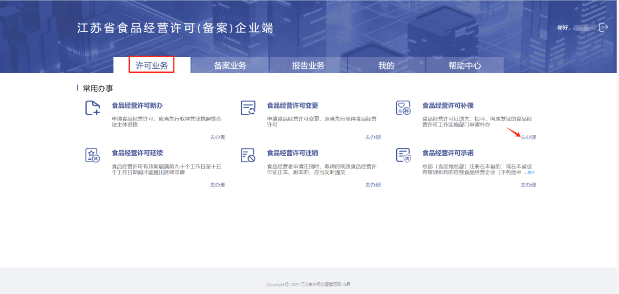 进入【许可业务】-【食品经营许可补领】,点击“去办理”进入食品经营许可补领申请页面