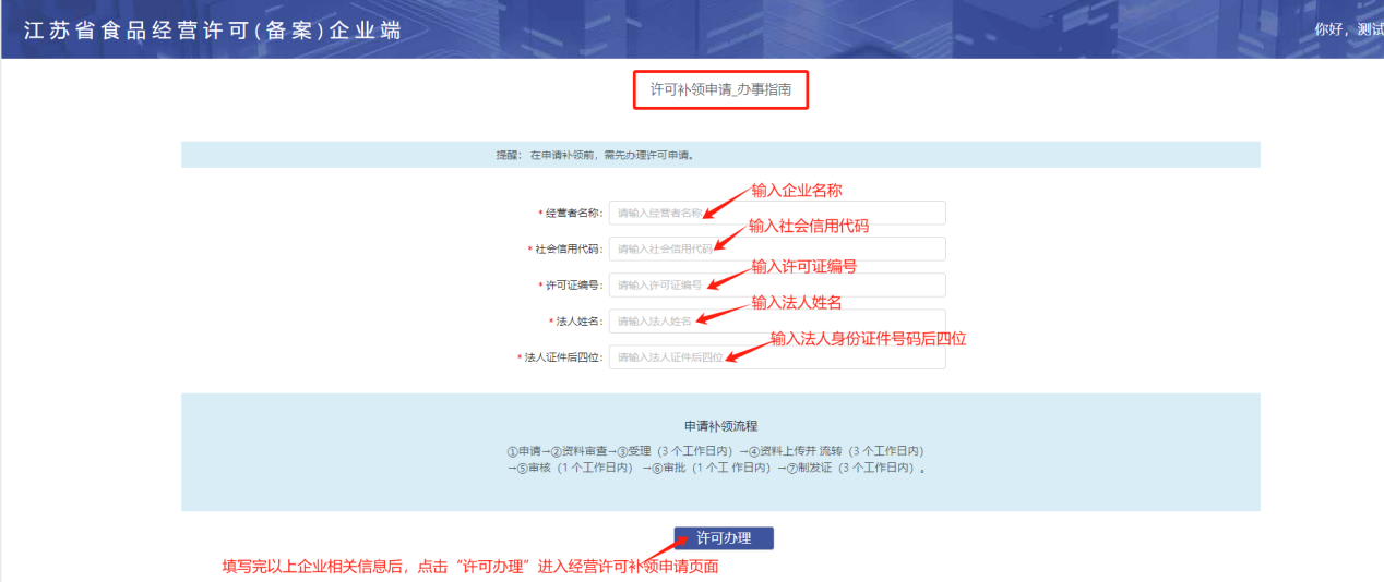 进入【许可补领申请-办事指南】菜单,填写需要办理食品经营许可证书补领业务的企业名称、社会信用代码、证书编号、法人相关信息内容后,点击【许可办理】