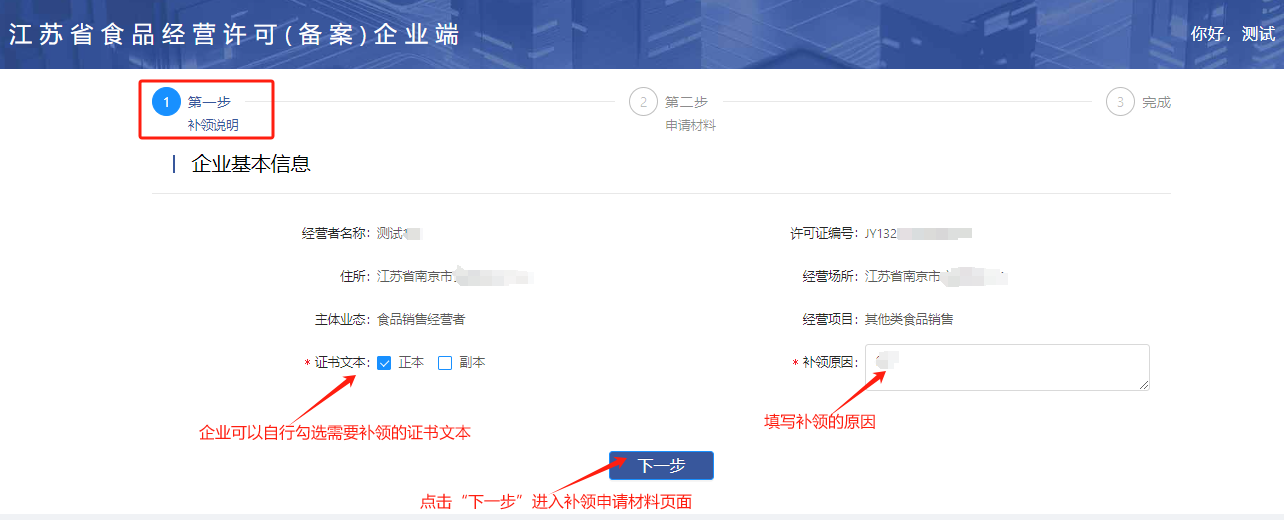 第一步:在【企业基本信息】中会显示经营许可证书的企业名称、许可证书编号、住所及经营场所地址、经营项目信息,选择需要补领的食品经营文本文件,填写【补领原因】,点击“下一步”进入补领申请材料页面