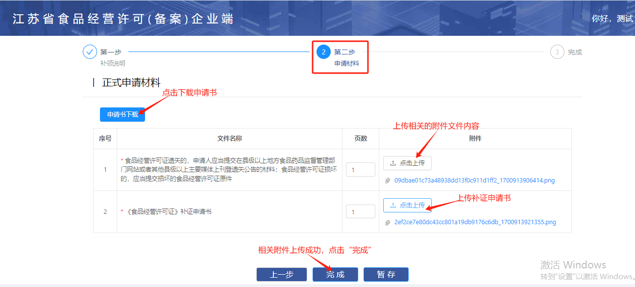 第二步:在【补领申请材料】菜单,点击【申请书下载】下载申请书,上传相关的材料及《食品经营许可证书》补证申请书上传附件后,点击【完成】提交。