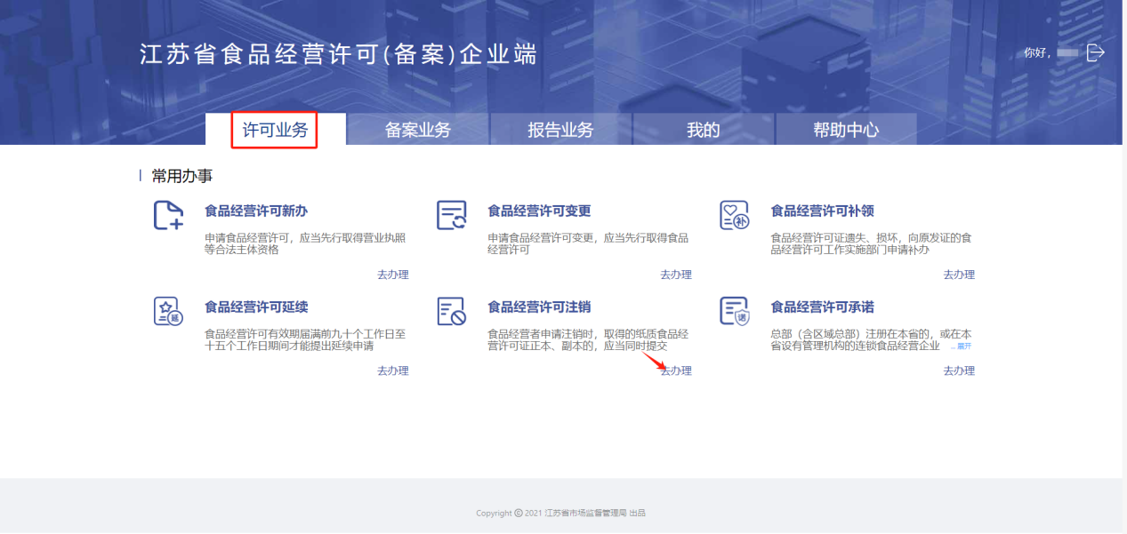 进入【许可业务】-【食品经营许可注销】,点击“去办理”进入食品经营许可注销申请页面