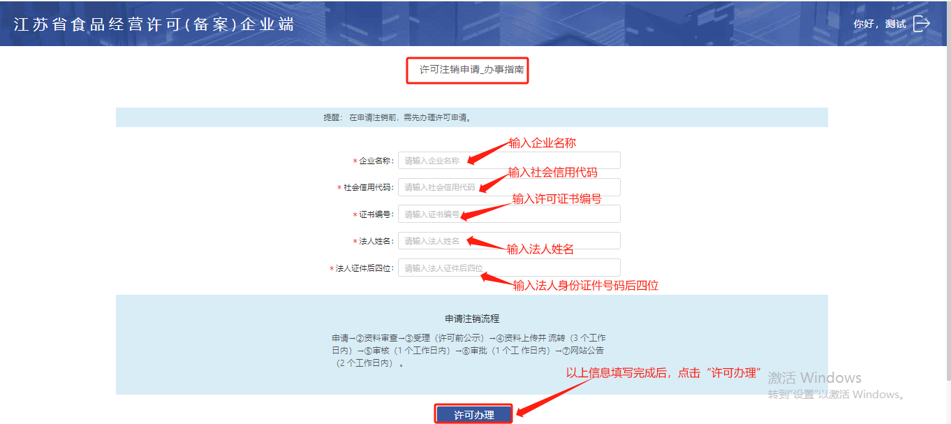进入【许可注销申请-办事指南】菜单,填写需要办理食品经营许可证书注销的企业名称、社会信用代码、证书编号、法人相关信息内容后,点击【许可办理】