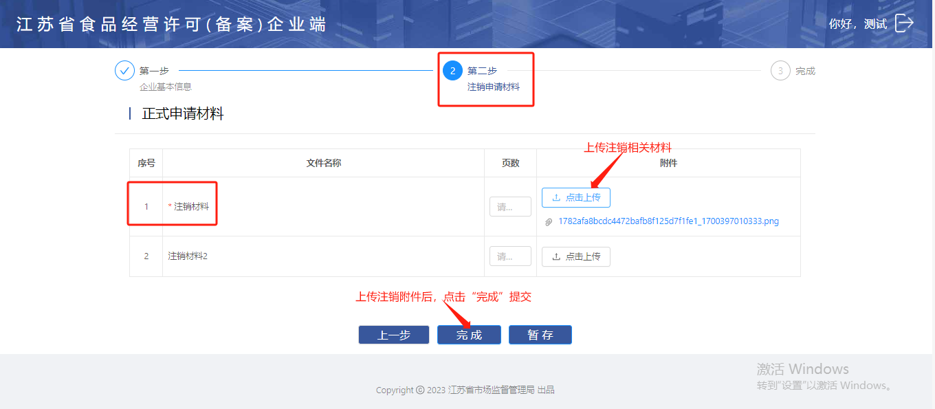 第二步:在【注销申请材料】菜单上传注销相关的材料文件,附件上传后,点击【完成】提交注销申请。