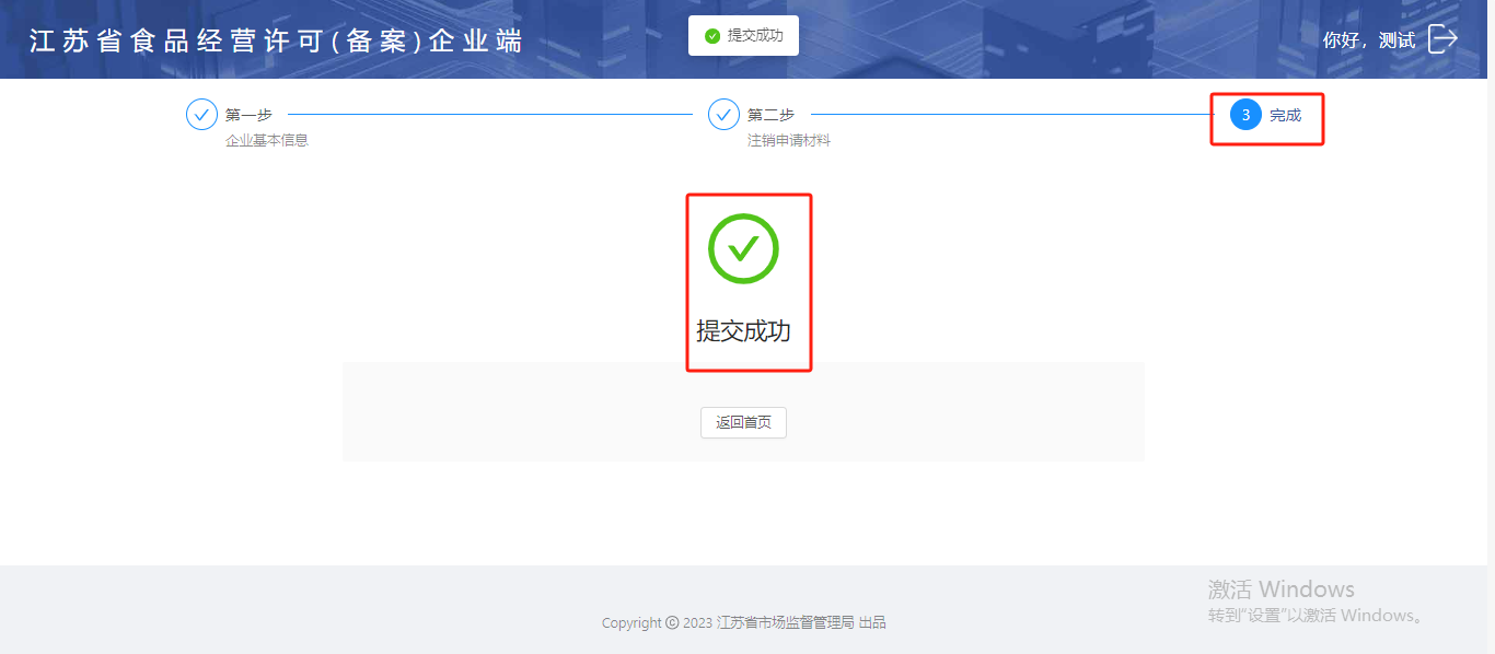 第三步:注销材料提交完成后,系统会显示【提交成功】。